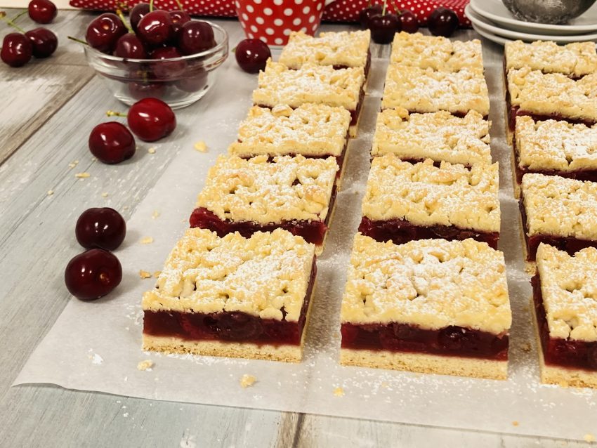 4. A cseresznyés pitét teljesen kihűtjük, majd szeleteljük és porcukorral meghintve tálaljuk.