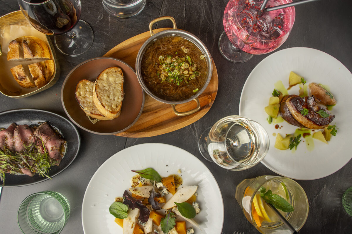 A vékonyra szelt marhasült és a házi briósra fektetett, karamellizált barackkal kísért kacsamáj erős kezdésnek bizonyult, a kéksajttal és körtével társított céklának és a sajtos krutonnal felszolgált francia hagymalevesnek hála pedig vegetáriánus kolléganőnk sem maradt éhes.
