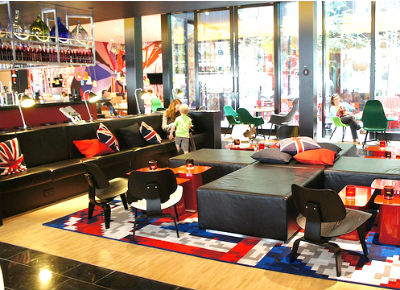 The modern lounge area makes the Qbic Hotel an affordable home base to explore The City. Photo: EuroCheapo