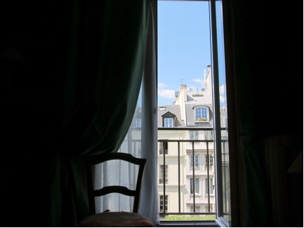 Each room has a balcony, some bigger than others. This one overlooks a side street, while the larger rooms allow a view of Rue de Rivoli, where you can even see the top of the Notre Dame: