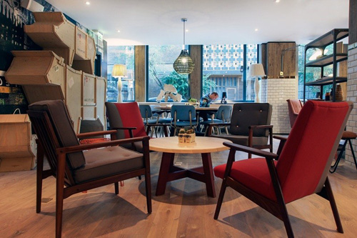 The modern lounge area makes the Qbic Hotel an affordable home base to explore The City. Photo: EuroCheapo