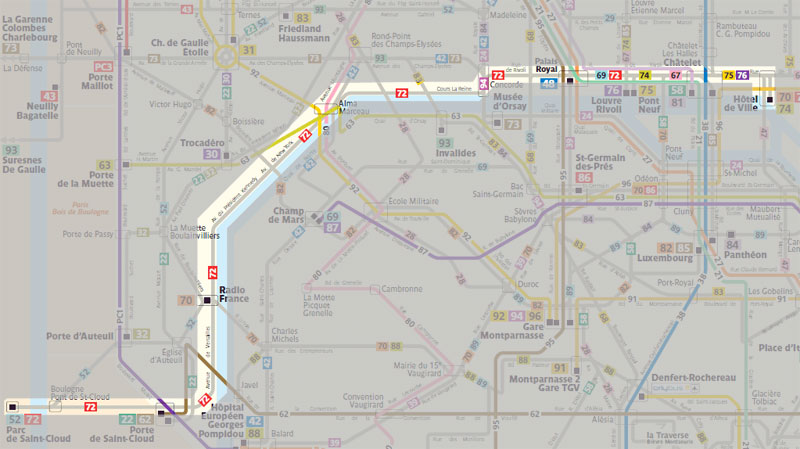 The 72 will take you all along the river, from the Eiffel Tower to Hotel de Ville, with a straight shot along the Right Bank. It also does a lap around the Louvre and the Tuileries before heading back to the riverside. It’s scenic, it’s simple, and it’s great for those who get carsick from lots of turning and weaving through traffic (guilty!).