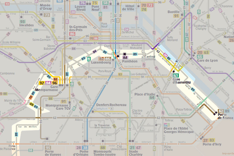 The 89 weaves through the Latin Quarter, giving you a great look at the Jardin du Luxembourg, the Panthéon, the Jardin des Plantes, and the Mosque, where you can stop (at Buffon – La Mosquée) for a €2 glass of some seriously delicious mint tea.