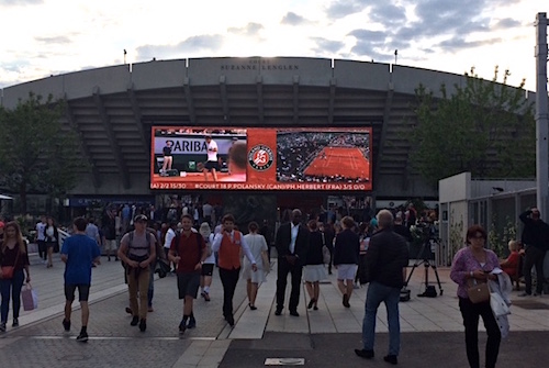 A few years ago we were in Paris for a week during the final days of the French Open tennis. We had no plans to go to Roland Garros but we were walking to the Hotel de Ville (City Hall) in the middle of the city. We found a gigantic screen that had been set up, lots of people, plus a court that people could play on. We watched Serena Williams on that giant screen for an hour or so. I don’t know if this is done every year and if it is set up during all two weeks of the play but that is really a cheapo way to watch the French Open at no cost and still feel that you