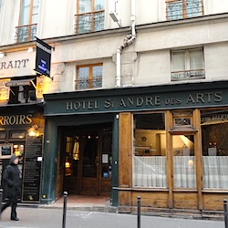 Situated along the cute (although heavily touristed) rue St-Andre-des-Arts in the 6th arrondissement, this hotel is an old-school cheapo, offering charming rooms with wood-beamed ceilings in a 16th-century building.