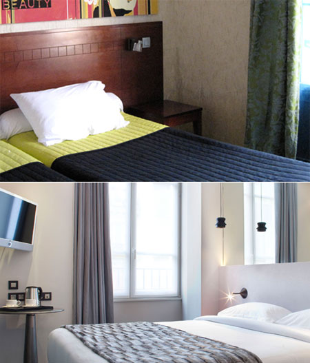 Things went quickly from budget to boutique when the once cheapo Sejour-Beaubourg (top) transformed itself into the Hotel Georgette (bottom). (Top photo by EuroCheapo, bottom photo from the Hotel Georgette’s website.)