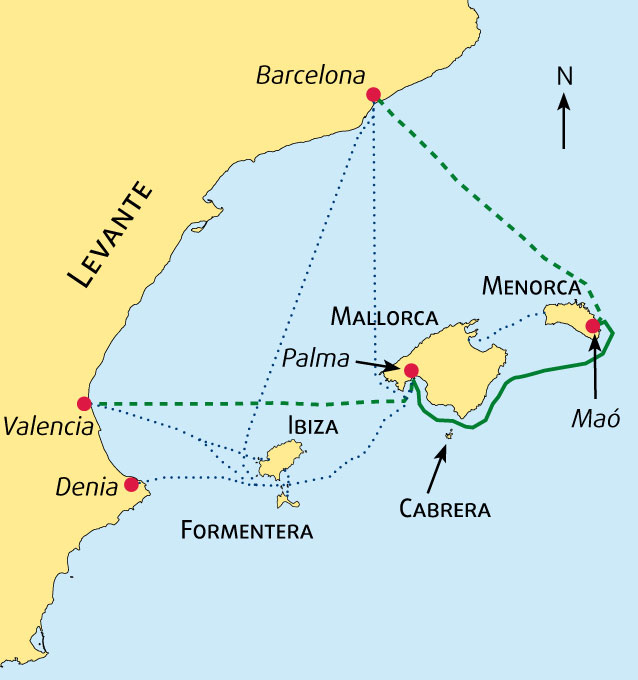 Each Saturday evening, the Albayzin leaves the Spanish port of Valencia for the overnight voyage to Palma, capital of the island of Mallorca. On the Sunday she continues by day from Palma to Maó, the principal port on Menorca.